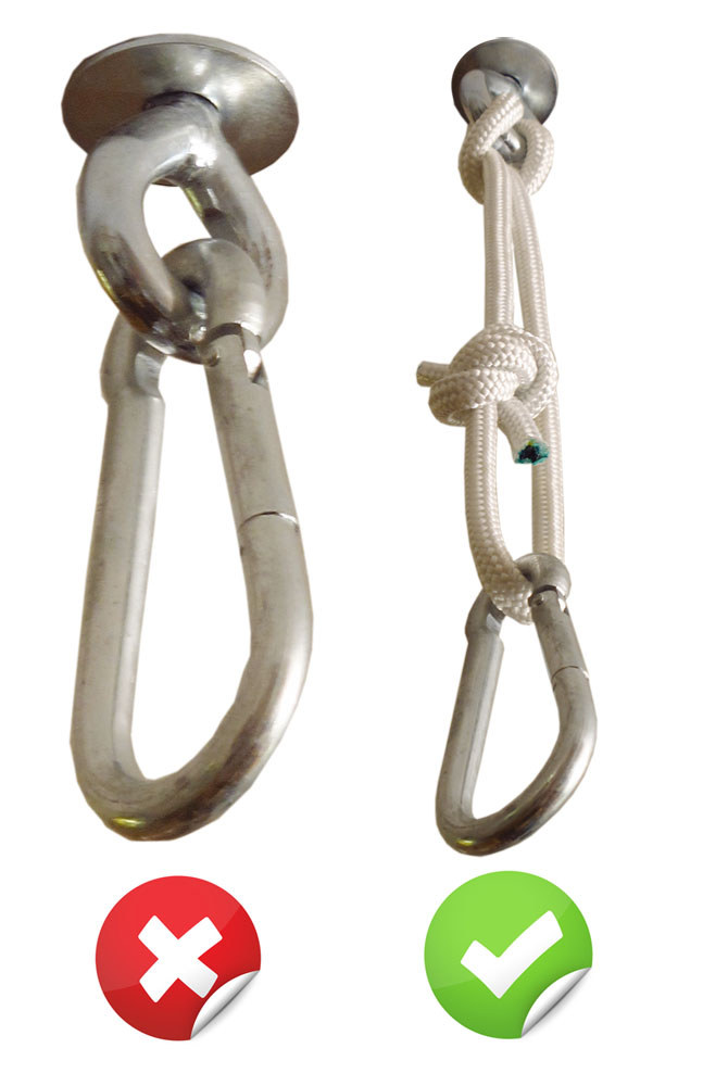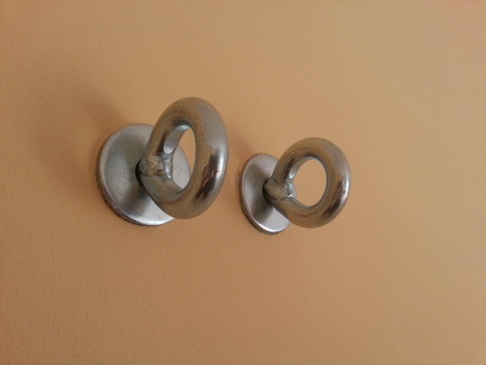 Három méretben kapható. A hosszabbakat akkor használjuk, ha a házfalon, erkélyen vastag szigetelés van. <i>© fuggoagy.hu</i>Csavar a plafonban, teljesen betekerve <i>© fuggoagy.hu</i>A csavar és a karabiner között mindig legyen egy darab kötél! Így megakadályozzuk a fémpor keletkezését és a csavar elkopását. <i>© fuggoagy.hu</i>Így nyílna szét, ha a lyuk engedné.Így nyílna szét, ha a lyuk engedné.Nem kicsi.Ha nem hiszel benne, hogy egy csavar elég, tegyél be kettőt...